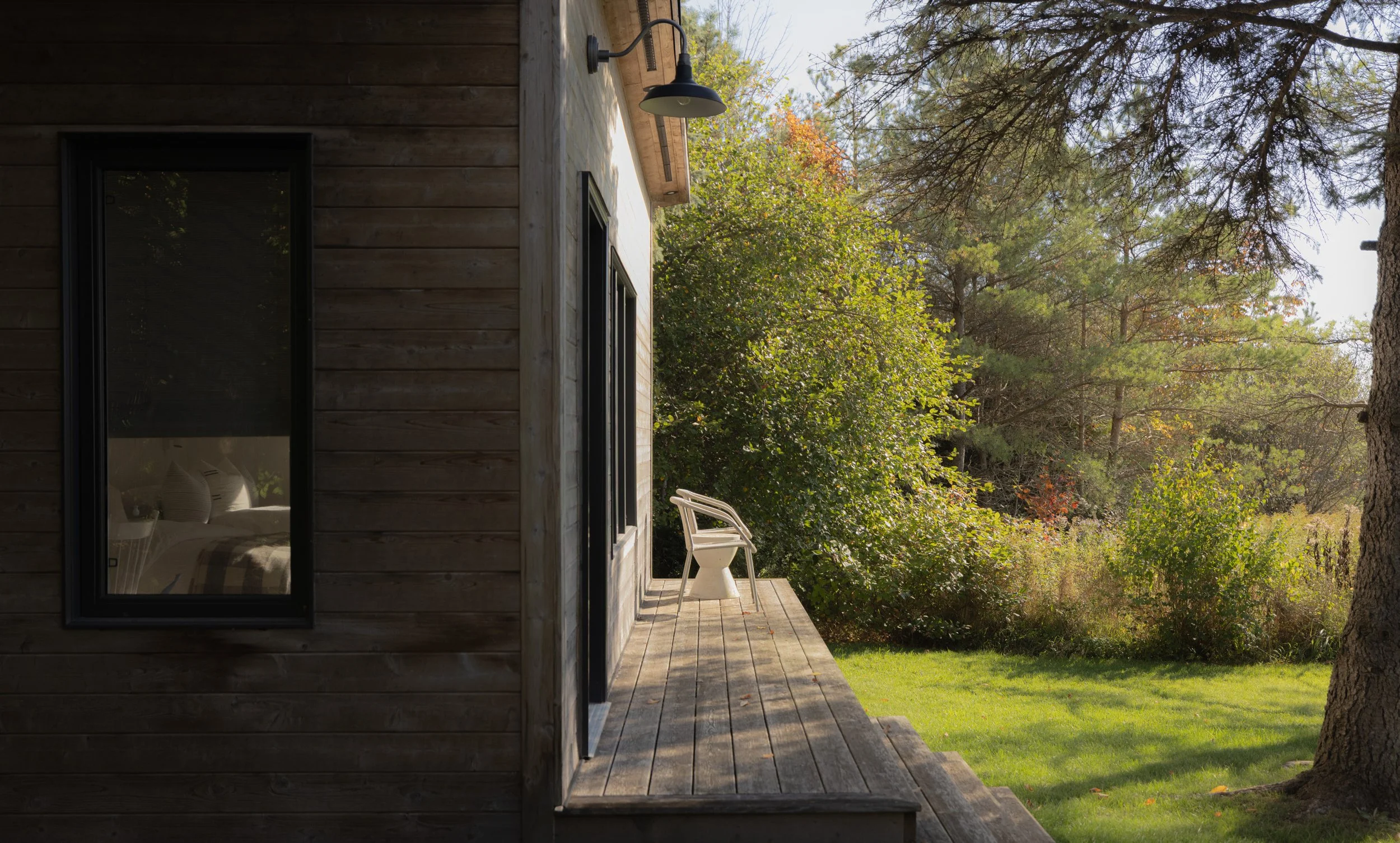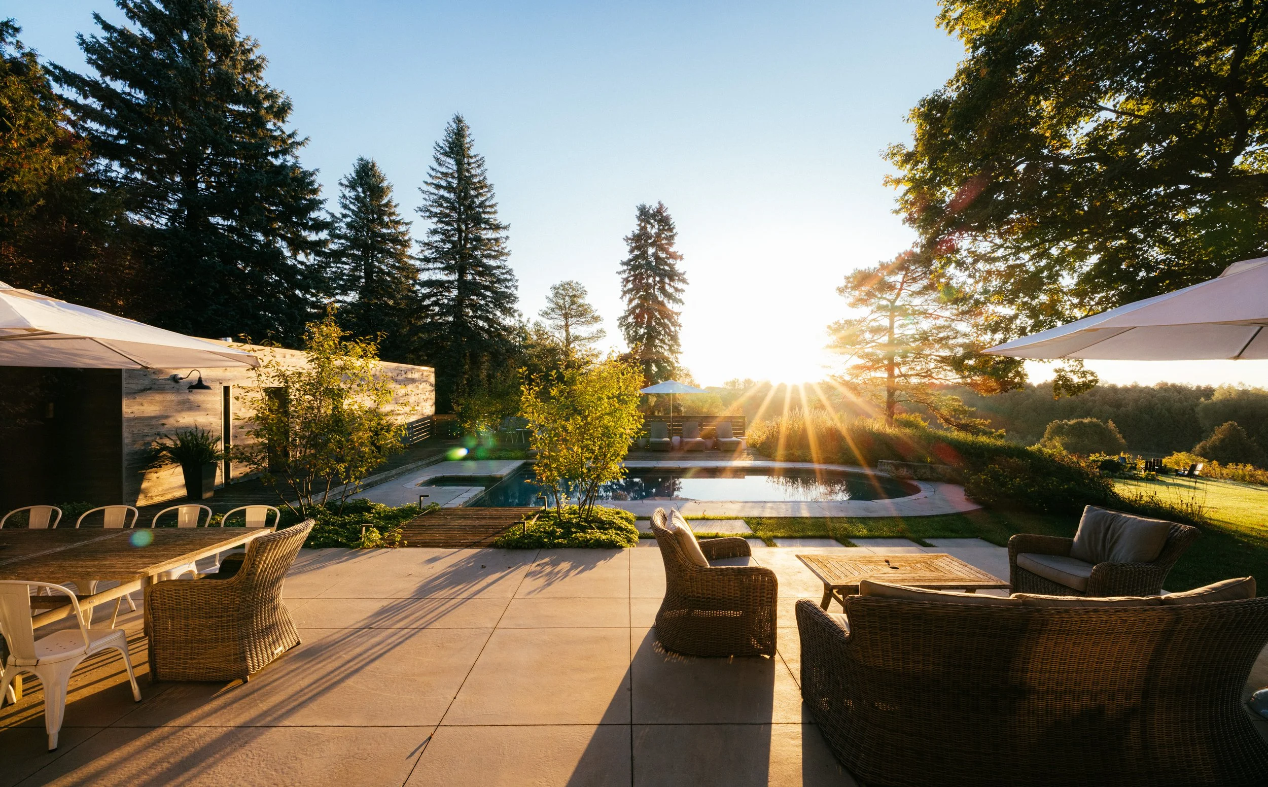 The grounds feature a tennis court with viewing pavilion, an in-ground Betz pool framed by patios and decks, a bunkie that sleeps four, and a private gym. Raised garden beds and a fire pit area enhance the rustic charm, while mature trees, curated landscaping, and landscape lighting create the perfect setting for country living.